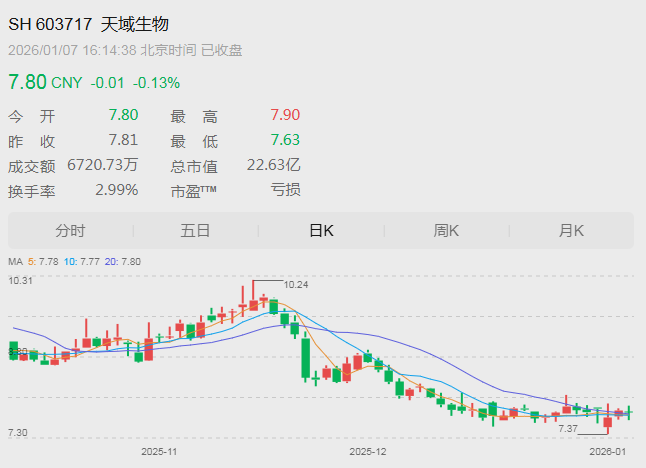 二级市场上,截至1月7日收盘,天域生物报7.8元/股,总市值22.63亿元。