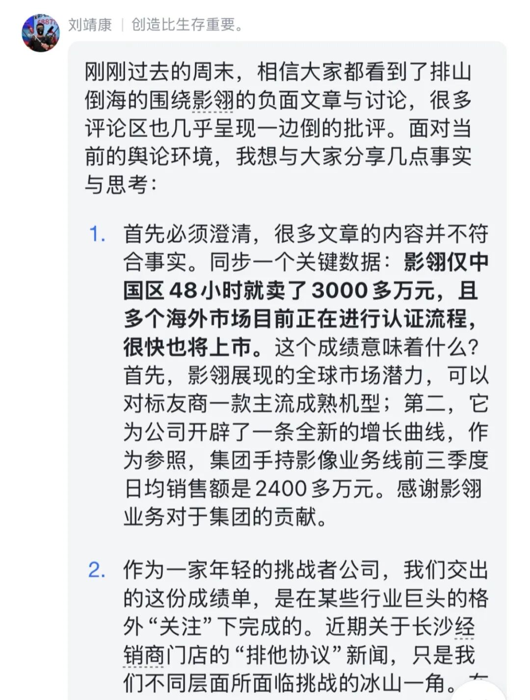 公开信中,刘靖康开篇即回应市场关切:影翎A1在中国区上市48小时销售额突破3000万元,多个海外市场认证流程已进入尾声,即将开启全球销售。刘靖康强调,这一成绩不仅对标友商成熟机型的市场表现,更验证了全景无人机作为影石第二增长曲线的战略价值。作为参照,集团手持影像业务线前三季度日均销售额是2400多万元。