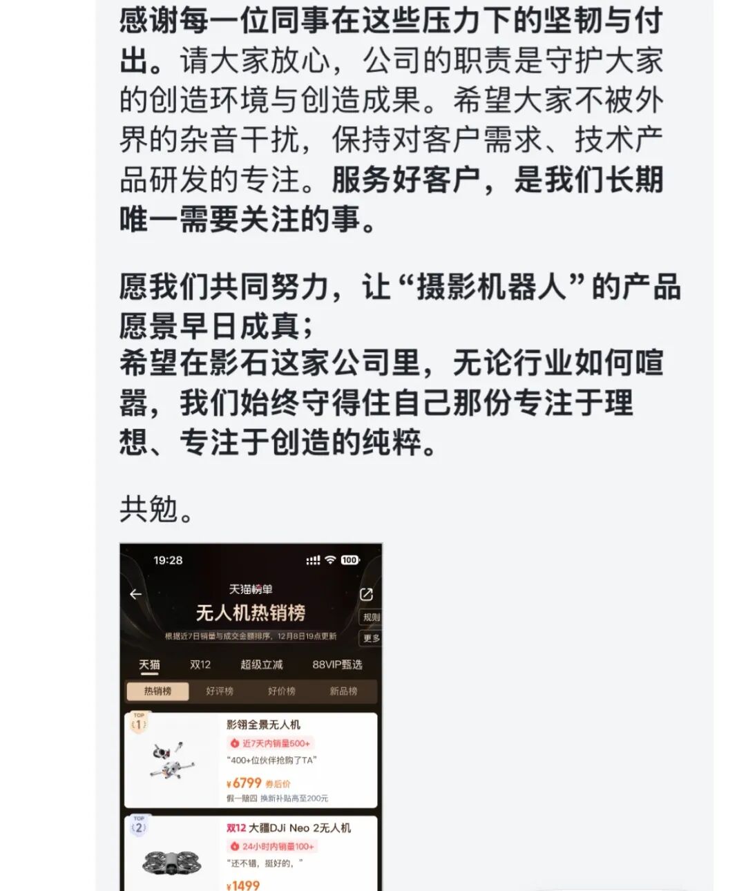 “刚刚过去的周末,相信大家都看到了排山倒海的围绕影翎的负面文章与讨论,很多评论区也几乎呈现一边倒的批评。”12月8日晚,影石创新董事长刘靖康在公司全员群发出公开信,回应新款无人机面临的市场竞争与行业质疑。