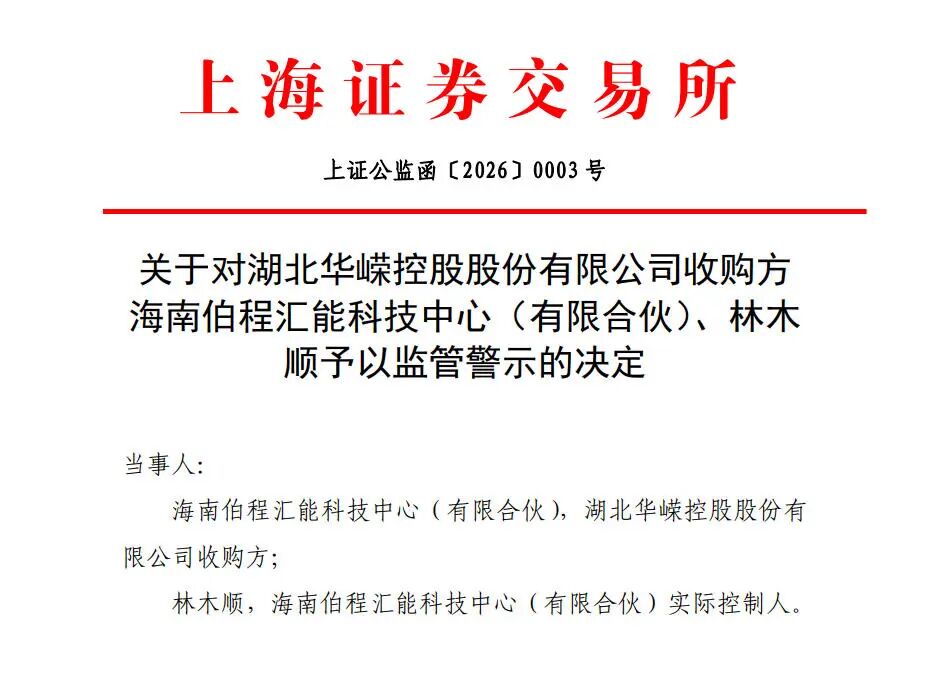 这是本次控制权转让事宜中,海南伯程及其实际控制人林木顺被第二次予以监管警示。2025年8月19日,上海证券交易所官网披露,因未按规则要求在签订股权转让协议后及时披露详式权益变动报告书,也未聘请财务顾问出具核查意见,影响投资者的知情权和合理预期,对*ST华嵘收购方海南伯程、林木顺予以监管警示。