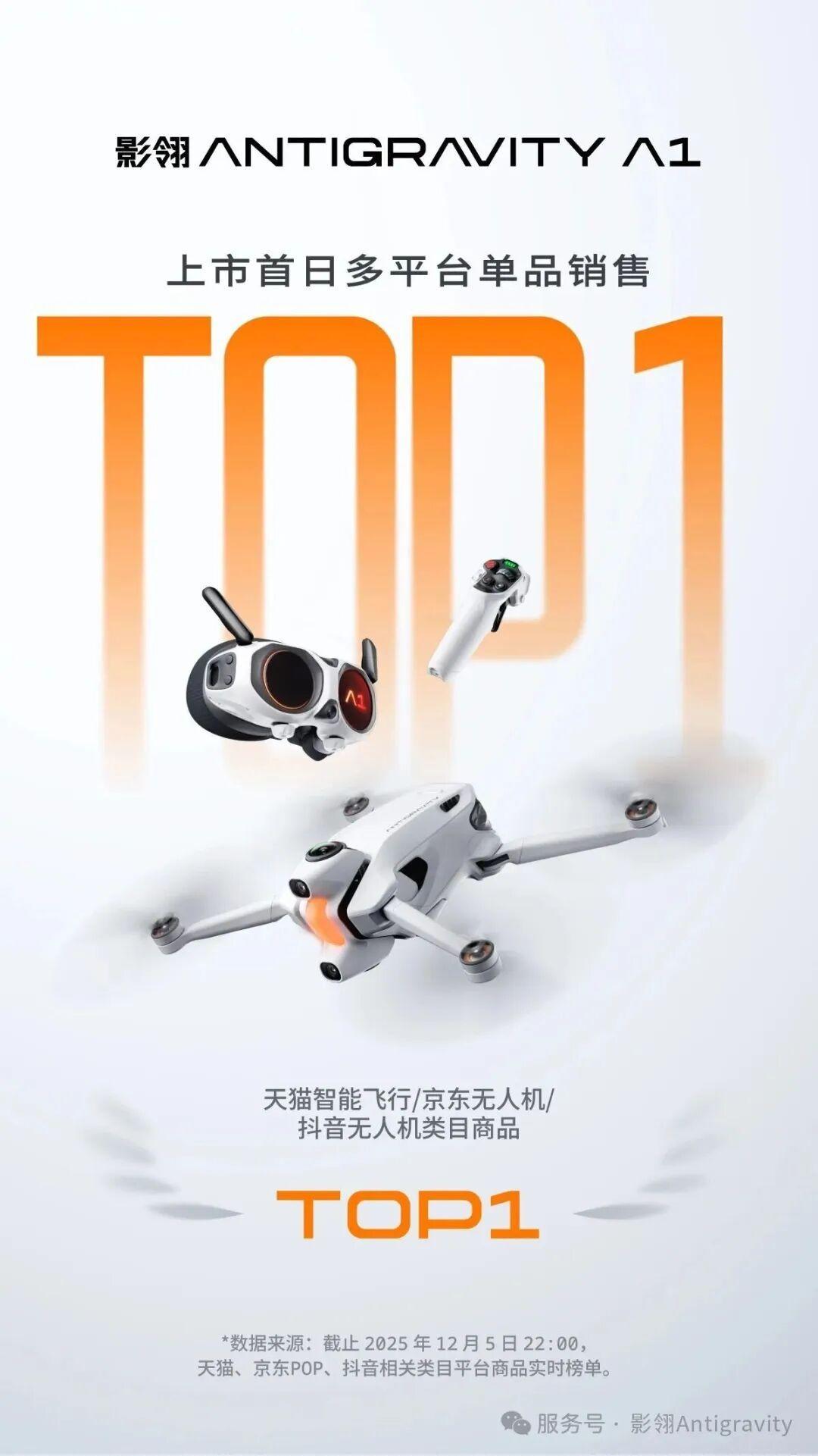 据影翎Antigravity公众号12月5日消息,影翎Antigravity A1上市首日,便包揽多平台单品销售第一。