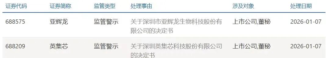 1月7日晚间,亚辉龙及有关责任人、英集芯及有关责任人,均被上交所予以监管警示。