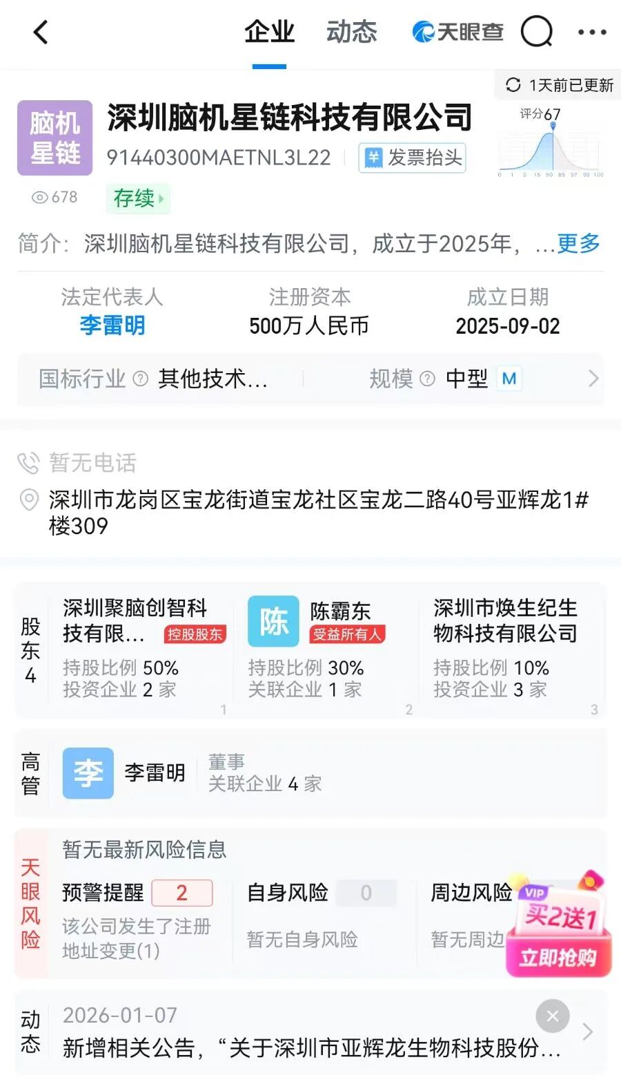 此外,21 世纪经济报道记者还从天眼查数据发现,脑机星链的地址正位于“亚辉龙1#楼309”。