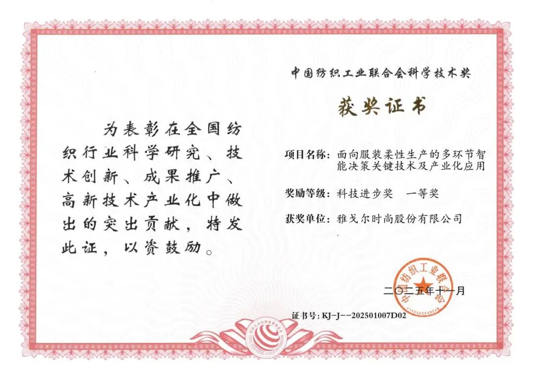 近期,2025年度中国纺织工业联合会科学技术奖励大会在北京人民大会堂隆重举行,对年度中国纺联科学技术奖获奖单位和个人进行表彰。在这场中国纺织行业的顶级科技盛会上,由浙江理工大学、雅戈尔(600177)时尚股份有限公司、浙江大学等单位联合完成的《面向服装柔性生产的多环节智能决策关键技术及产业化应用》项目,荣获中国纺织工业联合会科技进步奖一等奖!