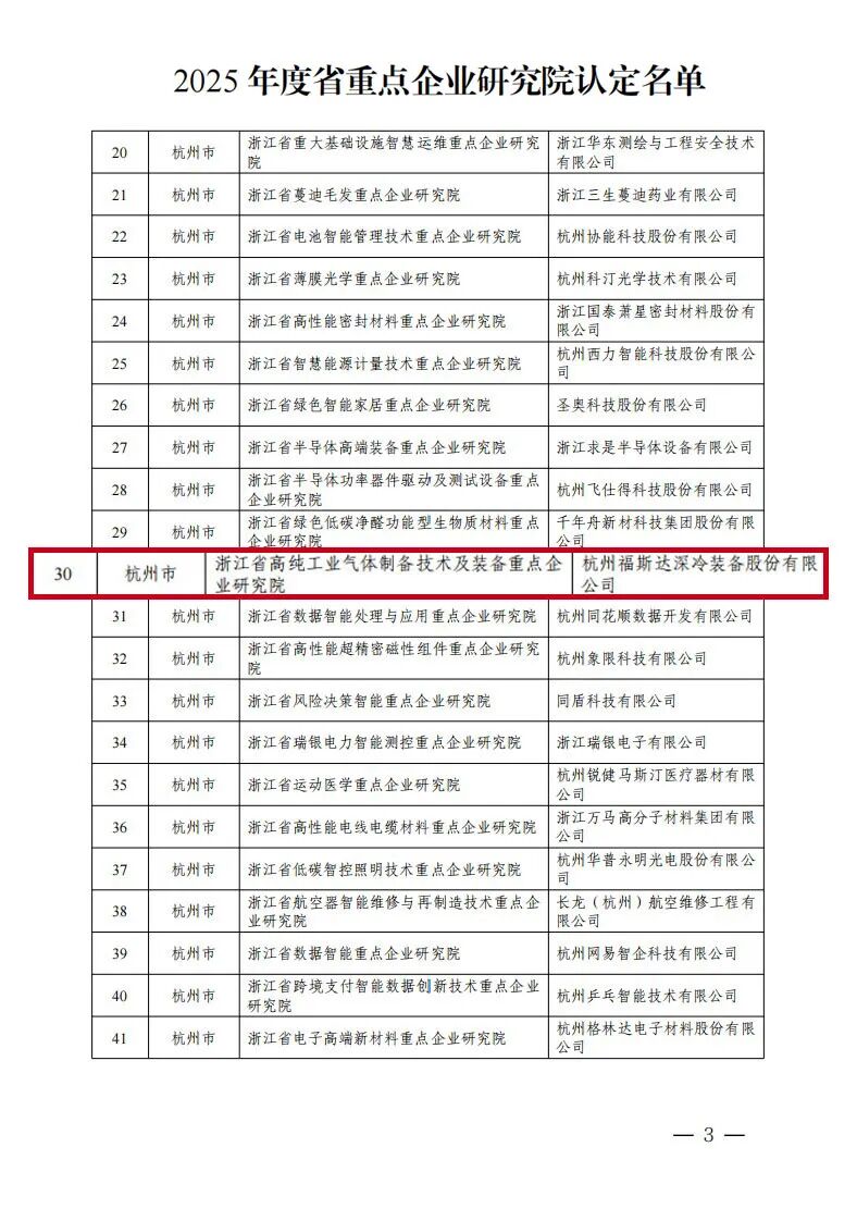 近日,浙江省经济和信息化厅公布了2025年度省级重点企业研究院认定名单,杭州福斯达(603173)深冷装备股份有限公司申报的“浙江省高纯工业气体制备技术及装备重点企业研究院”成功入选。此次认定,标志着省级层面对福斯达在工业气体装备建设领域技术实力与创新能力的权威认可。