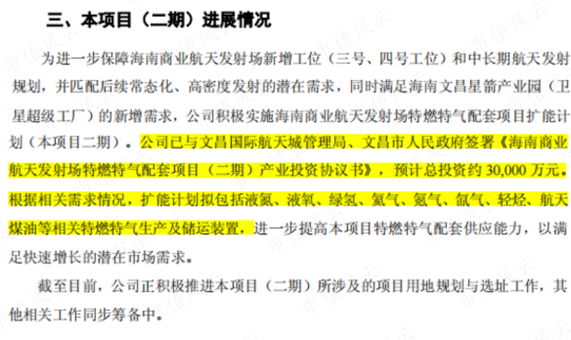 2025年9月30日,公司与文昌国际航天城管理局、文昌市人民政府签署投资协议,开始海南特燃特气项目二期的建设,预计总投资约3亿元,扩能计划包括液氮、液氧、绿氢、氦气、氪气、氙气、轻烃、航天煤油等相关特燃特气生产及储运装置。