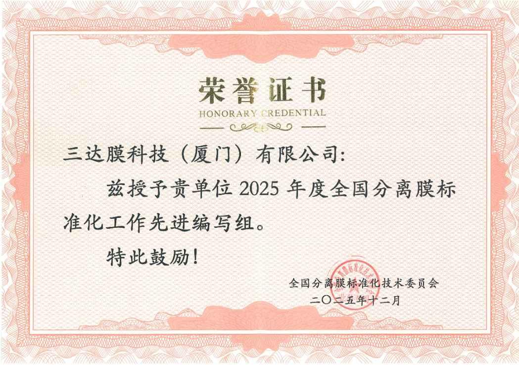 近日,全国分离膜标准化技术委员会(SAC/TC382)公布2025年度先进评选结果,三达膜旗下核心子公司三达膜科技(厦门)有限公司凭借在行业标准制定中的突出贡献,获评“全国分离膜标准化工作先进编写组”。