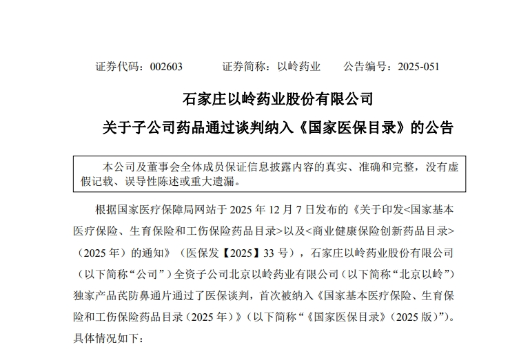 2025年12月8日,以岭药业(002603)(002603.SZ)正式公告其中药1.1类创新药芪防鼻通片纳入《国家基本医疗保险、生育保险和工伤保险药品目录(2025年)》。从2025年1月获批上市、7月拿下澳门首个创新中药注册批件,到12月成功跻身医保目录,这款针对过敏性鼻炎的新药以“11个月三连跳”的节奏,成为以岭药业锚定现代中药高质量发展的具象实践——其背后的每一步进展,均依托公开可查的理论原创、循证数据与产业布局成果。