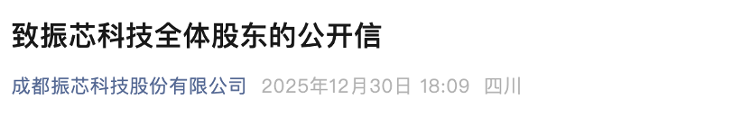 除了此次外部处罚,公司内部治理层面的挑战亦不容忽视。2025年12月30日晚,振芯科技通过官方微信公众号发布了一封《致振芯科技全体股东的公开信》。