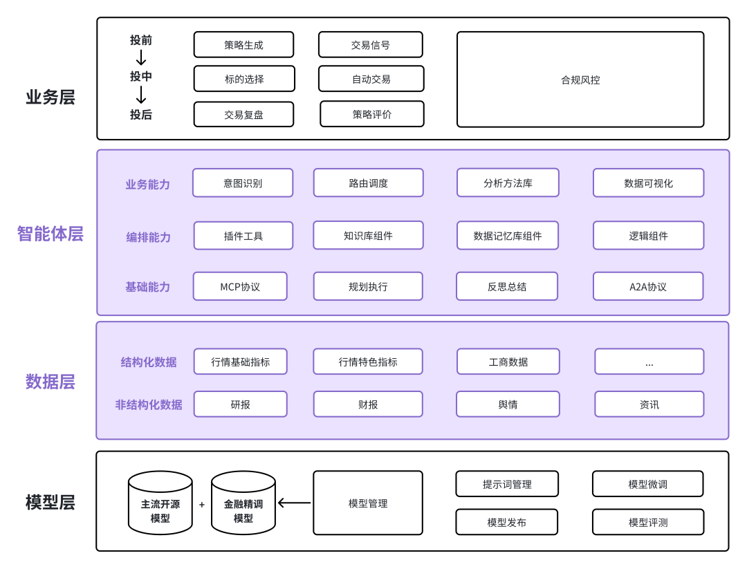 面对这一行业趋势及风险挑战,同花顺基于专业的金融垂类数据与同创智能体工坊,以 “业务层 - 智能体层 - 数据层 - 模型层” 的四层架构为支撑,搭建选股、择时、交易等专属智能体,让AI实现从投前、投中、投后的全流程闭环。