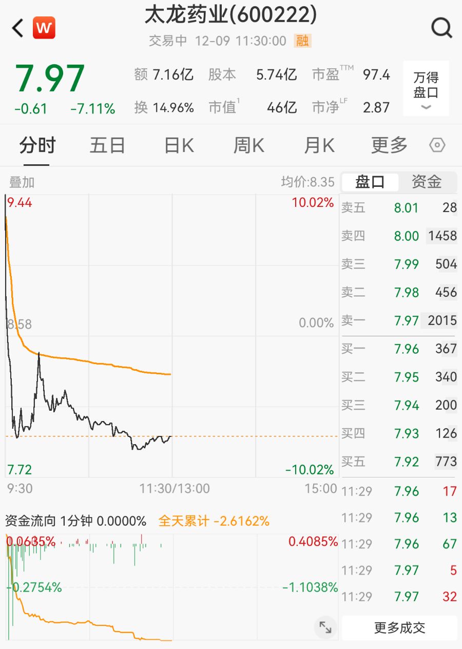 12月9日,太龙药业(600222)(600222.SH)复牌后涨停开盘,随后急速下杀翻绿,10分钟内跌超15%,维持低位震荡走势。截至午间收盘,报7.97元/股,跌7.11%。
