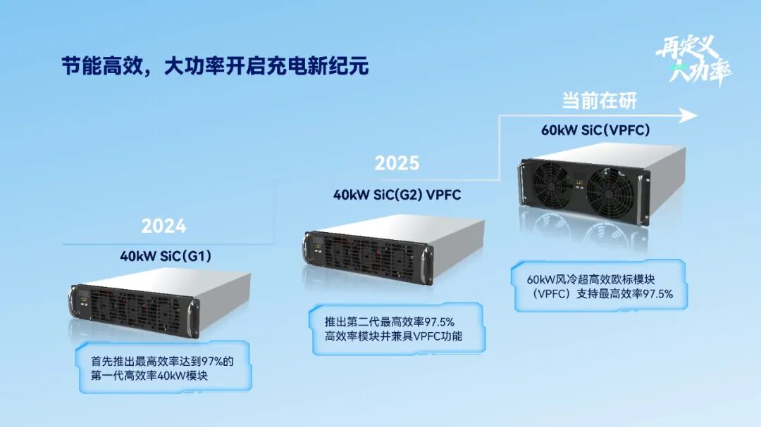 在高效率欧标模块方面,优优绿能在2024年首先推出最高效率达到97%的第一代高效率40kW模块,并在2025年推出第二代最高效率97.5%超高效率模块并兼具VPFC功能。当前,处于在研状态的60kW风冷超高效欧标模块(VPFC),支持最高效率97.5%,也将很快推向全球市场。