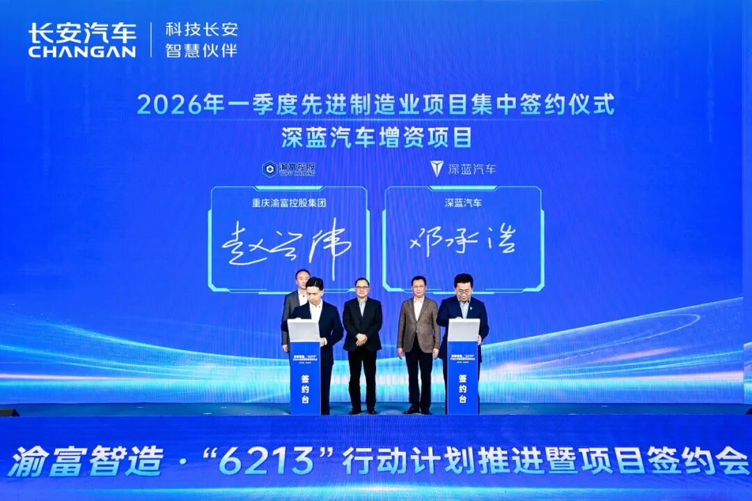 1月8日,为推动重庆市“33618”现代制造业集群体系和“416”科技创新布局,由市国资委主办、重庆渝富控股集团承办的渝富智造“6213”行动计划推进暨项目签约会在重庆举办。长安汽车(000625)、深蓝汽车分别与重庆渝富控股集团签署合作协议。重庆市国资委党委书记、主任曾菁华,中国长安汽车党委书记、董事长朱华荣及重庆渝富控股集团党委书记、董事长谢文辉出席活动并见证签约。长安汽车总会计师张德勇与重庆渝富控股集团财务总监胡淳代表长安汽车与重庆渝富控股集团双方签署战略合作协议;长安汽车副总裁、深蓝汽车董事长邓承浩与重庆渝富控股集团副总经理赵兴伟代表深蓝汽车与重庆渝富控股集团双方签署深蓝汽车增资项目合作协议。