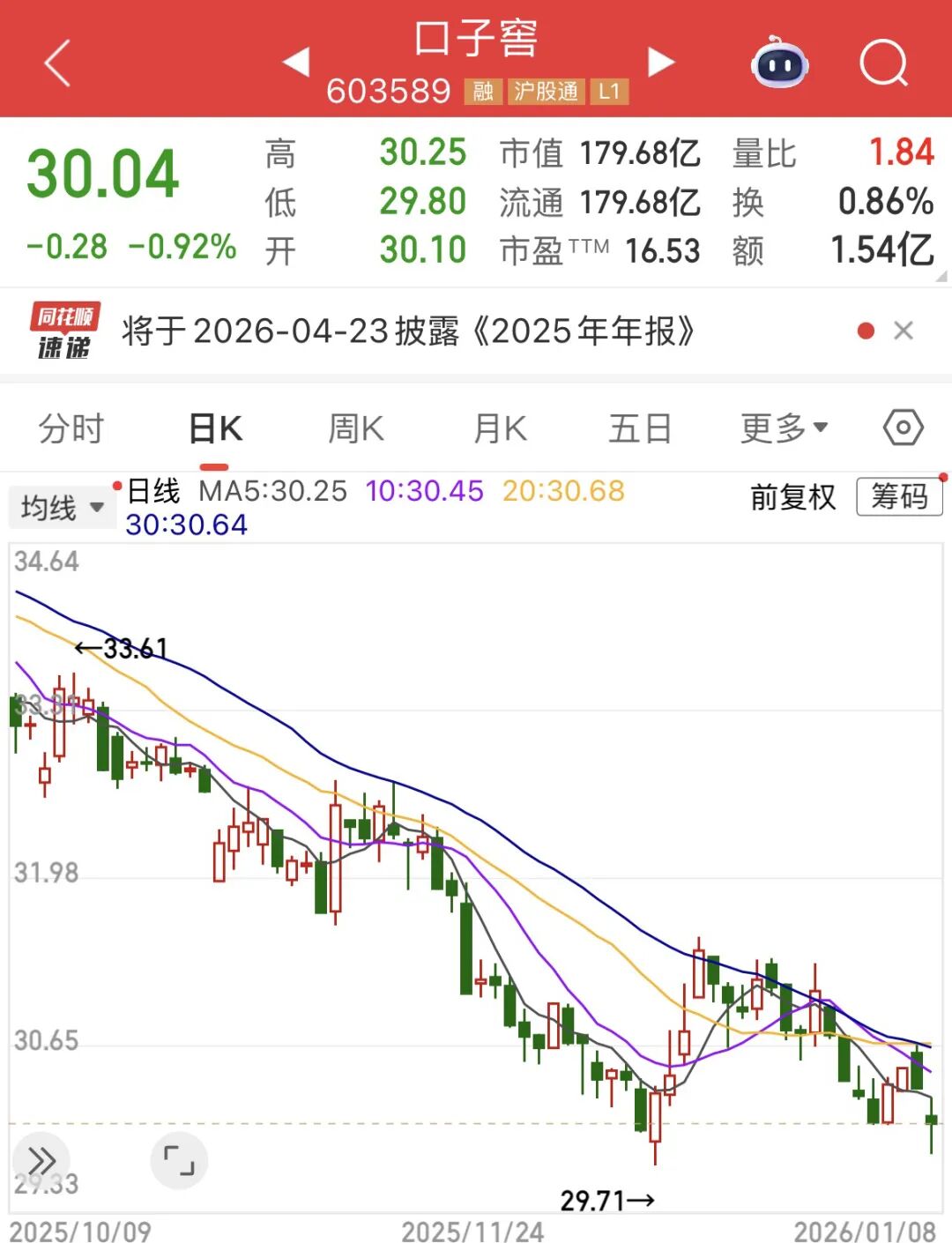 对于这份腰斩的“成绩单”,市场似乎并不意外。1月8日,口子窖以30.1元的价格低开,收跌0.92%,收盘价30.04元。