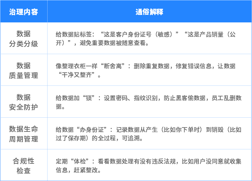数据也有“质量标准”:是否准确(比如客户电话有没有错)、是否完整(比如订单信息有没有漏填)、是否及时(比如库存数据是不是实时更新)。数据治理就是建立这套标准,让“坏数据”变“好数据”。