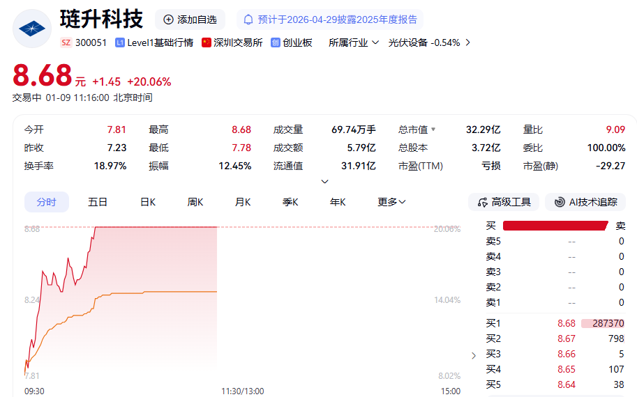 1月9日,琏升科技(300051)延续涨势,盘中快速拉升实现“20cm”涨停,报8.68元/股。截至发稿,换手率18.97%,成交额5.79亿元。