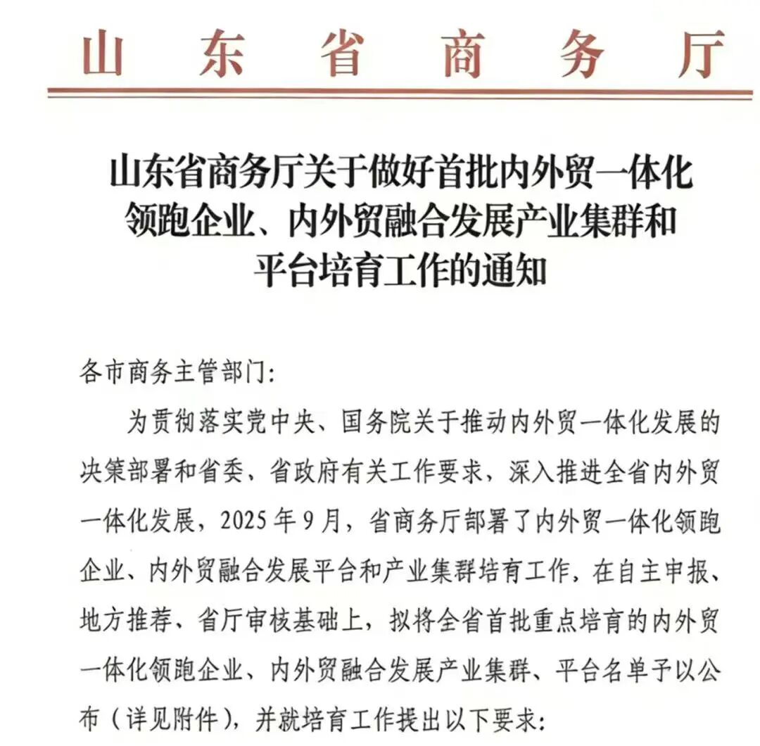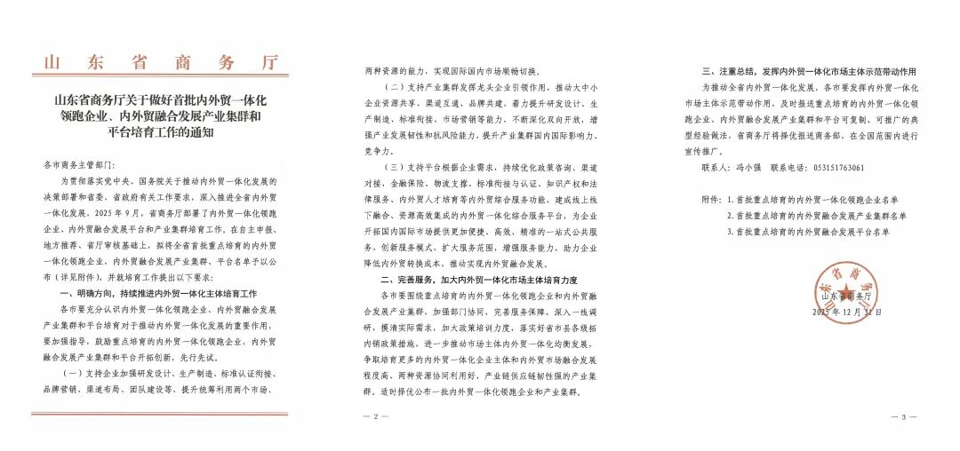近日,山东省商务厅公布全省首批重点培育的内外贸一体化领跑企业名单,旨在通过市场化实践推动产业升级、增强经济韧性,并为全国提供可借鉴的发展模式。百龙创园(605016)凭借扎实的创新实力、完善的全球布局和优异的内外贸融合发展成果成功入选。