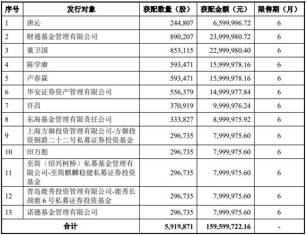 据公开资料显示,莱尔科技本次发行对象共有13名,均以人民币现金方式参与认购,全部发行对象认购的股票自本次发行结束之日起六个月内不得转让。公司本次发行募集资金总额159,599,722.16元,募集资金净额为153,816,994.29元。