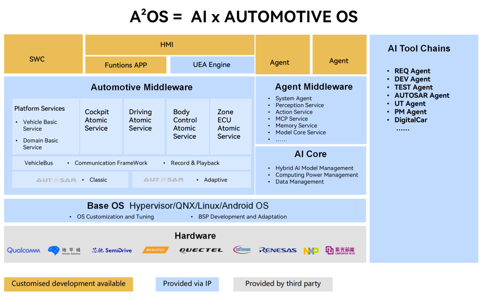 随着汽车产业迈入AIDV时代,AI正在深度融入操作系统。光庭信息推出的A OS是面向中央计算架构的下一代整车操作系统,支持人机协同开发,赋能域控软件快速研发。A OS融合了AI大模型与整车OS能力,在软硬解耦的架构下,构建出AP/CP一体化平台,支持插件化部署和服务化通信,适配多种域控形态。A OS不仅下沉了智能化能力,提供Agent中间件与多模态支持,还配套了人机协同的开发工具链和仿真验证环境,加速软件的开发与测试,提升交付效率。目前A OS已覆盖从中央控制器到传统MCU的全场景,助力OEM和Tier1在AI驱动下实现高质量、快速迭代的软件开发。