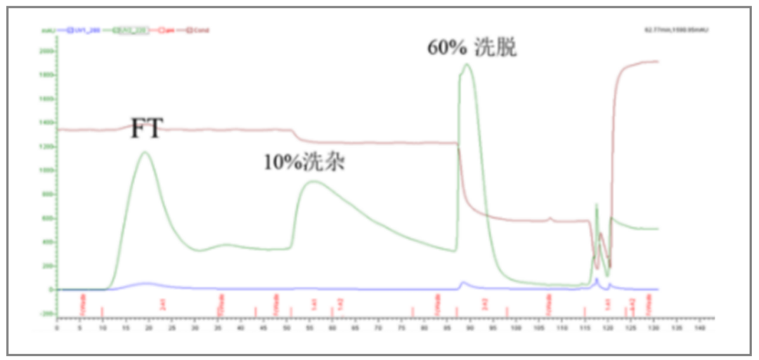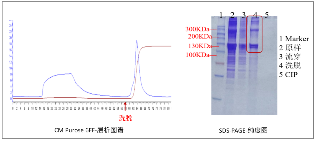 图1. CM Purose 6FF层析图谱(左);SDS-PAGE纯度图(右)