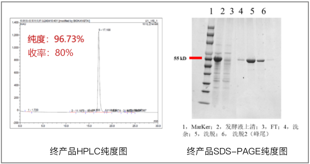该案例为毕赤酵母表达系统表达的胶原蛋白,目标蛋白由毕赤酵母分泌表达至发酵上清中,有利于下游纯化的初步处理。料液经过澄清、超滤浓缩处理后,采用Phenyl Purose 6FF(HS)高载量苯基疏水层析介质进行精纯。该介质具有高动态结合载量、良好的化学稳定性与机械强度,适合规模化生产。层析图谱显示,在约60%洗脱条件下目标蛋白被有效洗脱,与约10%洗杂峰分离明显,终产品HPLC纯度图显示最终产品纯度96.4%,收率65%,满足工业化生产需求。