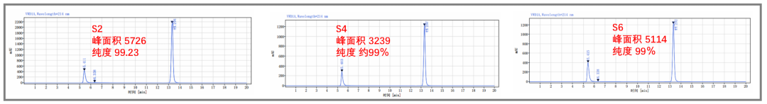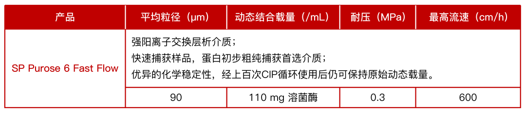 该案例为CHO表达系统表达的难溶性三螺旋胶原蛋白,料液经过澄清处理后,在pH 3条件下使用SP Purose 6FF进行阳离子交换层析,该介质载量高、稳定性强、流速快、使用寿命长,适用于蛋白的早期捕获与粗纯,在规模化生产中具有明显的效率与经济性优势。数据显示,不同洗脱组分(S2、S4、S6)均获得高纯度产品,其中纯化效果最好的S2产量高、纯度高达99.23%,SP Purose 6FF能够稳定地将目标蛋白与杂质分离,满足规模化生产要求。