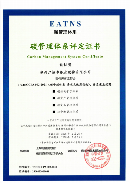 近日,恒丰纸业(600356)顺利通过SGS通标标准技术服务有限公司评定审核和上海环境(601200)能源交易所碳管理体系评定工作委员会复核评审,并获体系认证公示,正式收到《EATNS碳管理体系评定证书》。这标志着公司建立健全了碳管理工作,使公司具备了完备的全流程碳管理能力,从排放监测到交易策略制定形成完整链条。通过标准化管理流程和成果,展现公司实现双碳目标的能力,为行业低碳转型提供了可复制的实践样本。