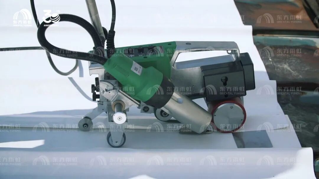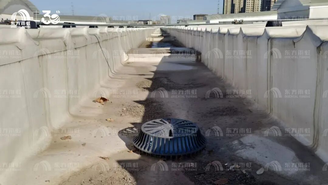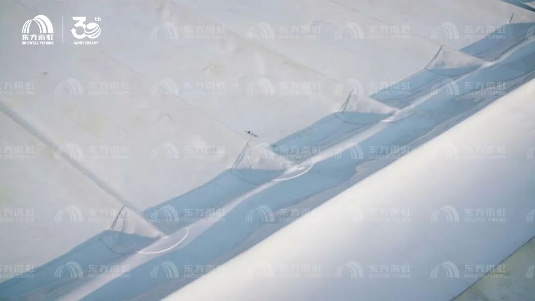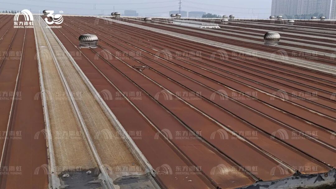 方案核心技术采用东方雨虹高分子TPO复合防水卷材,其突出的性能优势能够为屋面提供长效保护。施工过程中,通过专用胶粘剂实现卷材与金属屋面基层的满粘处理,并运用热空气焊接技术确保搭接缝的严密性。