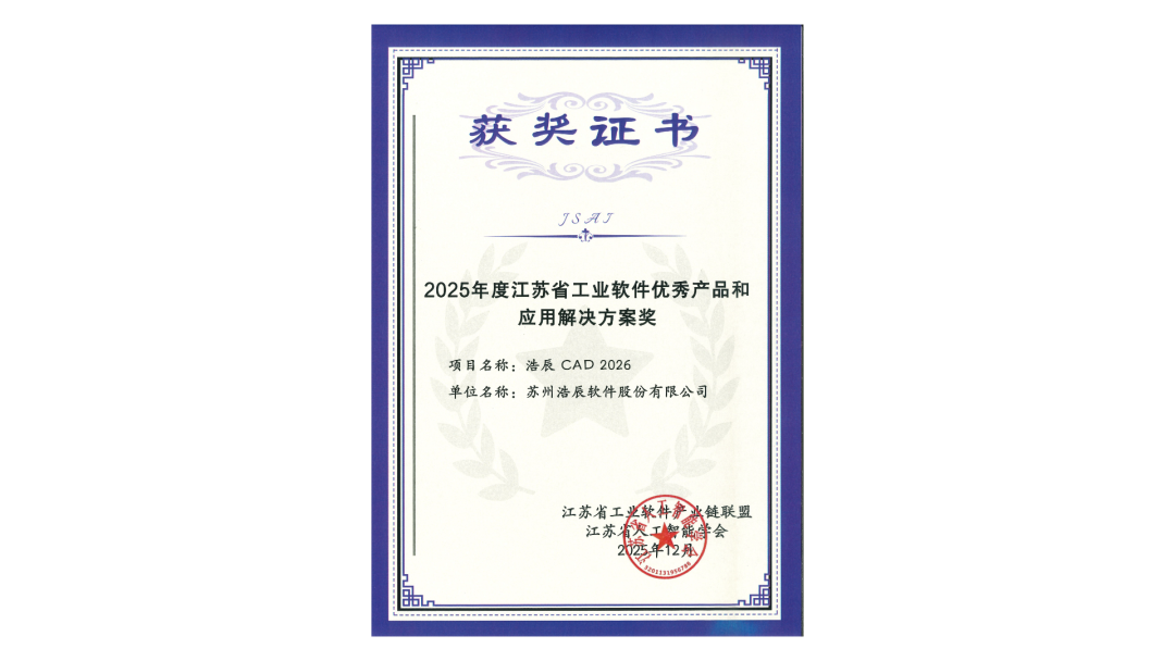 在刚刚揭晓的2025年度江苏省工业软件领域标杆成果评选中,苏州浩辰软件股份有限公司旗下核心产品——浩辰CAD 2026,凭借卓越的技术创新能力与夯实的产业应用价值,荣获“江苏省工业软件优秀产品和应用解决方案奖”。