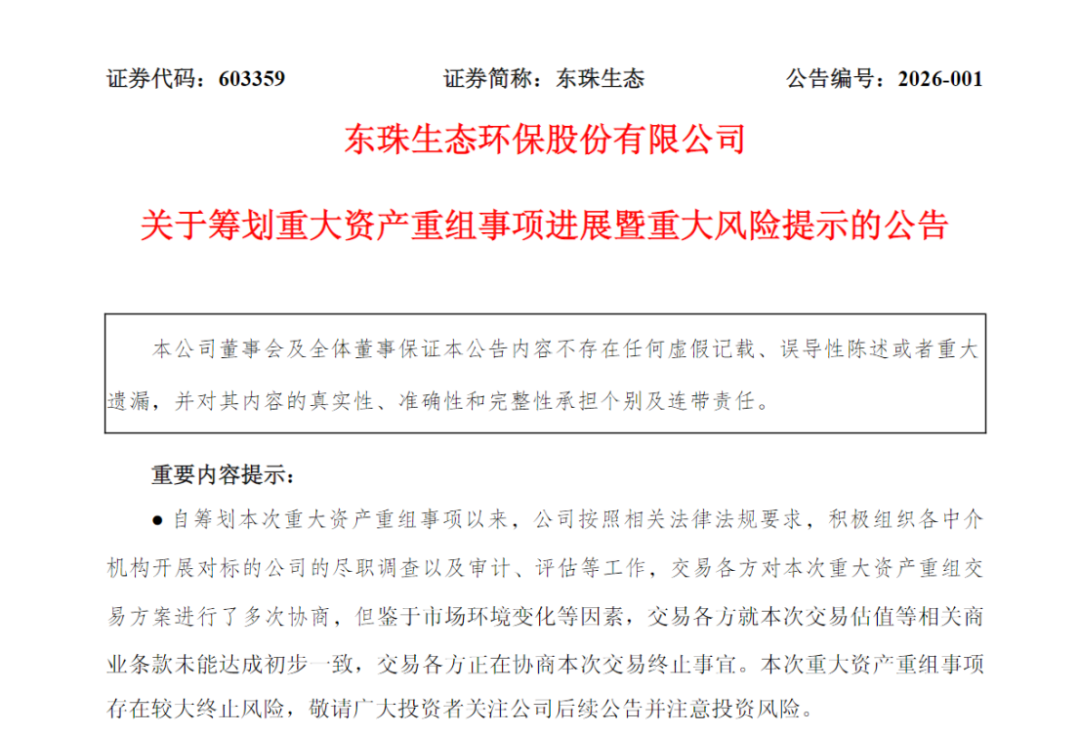 1月9日晚,东珠生态(603359)(603359)披露重大风险提示,公司正在筹划以发行股份及支付现金的方式收购凯睿星通信息科技(南京)股份有限公司(简称“凯睿星通”)的控制权,同时拟募集配套资金。但鉴于市场环境变化等因素,交易各方就本次交易估值等相关商业条款未能达成初步一致,交易各方正在协商本次交易终止事宜。本次重大资产重组事项存在较大终止风险,后续公司及交易对手方将及时推进办理终止本次交易的相关事宜。