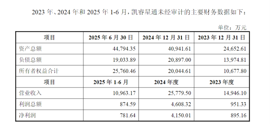 凯睿星通未经审计财务数据显示,2023年、2024年及2025年上半年,其营业收入分别约1.49亿元、2.58亿元、1.10亿元,净利润分别约895万元、4150万元、782万元。