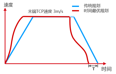 TOPP算法通过满足“起止速度为零、起止加速度为零、起止Jerk为零、起止Snap为零“等边界条件。这确保了机器人在启动、运行和停止的整个过程中,确保运动过程平滑稳定;更为重要的是,算法综合考虑了关节速度限制、关节力矩约束等10项关键动力学约束,在保证安全的前提下实现了运动轨迹的优化,使末端TCP速度达到3000mm/s,节拍时间提升约25%,显著提升生产效率!