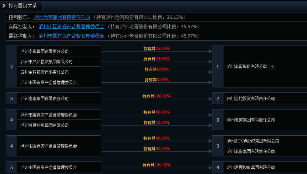 从股权结构来看,泸州老窖集团有限责任公司(老窖集团)、泸州市兴泸投资集团有限公司(兴泸集团)、四川金舵投资有限责任公司(金舵投资)、泸州市国资委分别持有泸州老窖26.05%、24.86%、0.08%、0.08%的股份,合计持有泸州老窖51.07%股份。