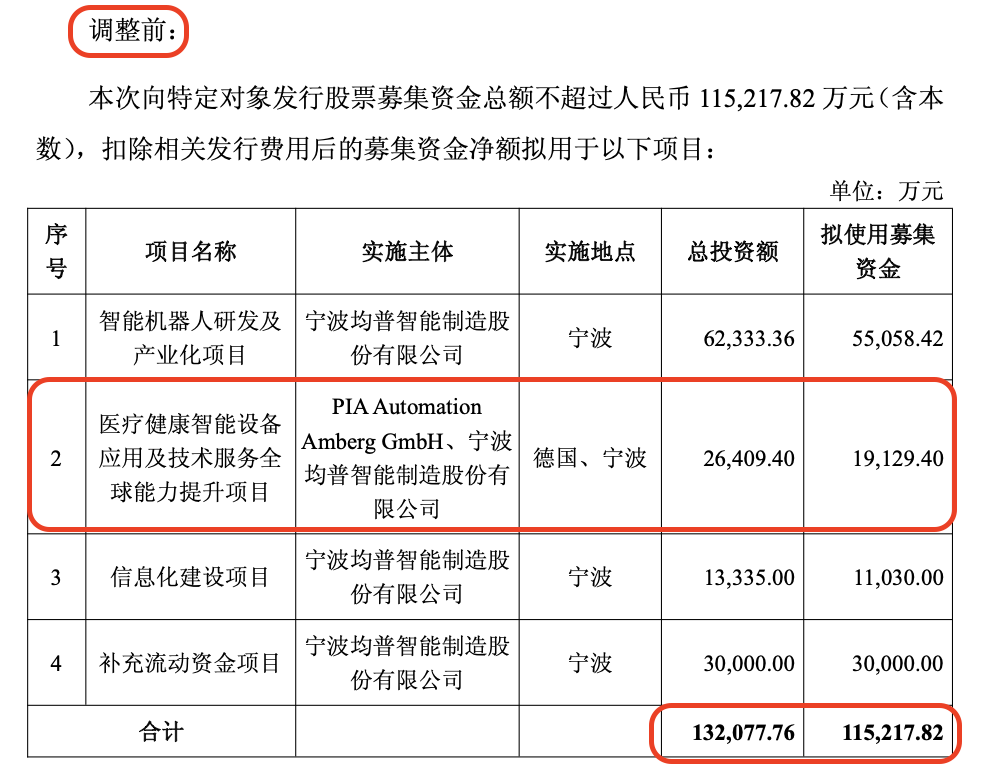 部分募投项目名称、实施主体、地点、投资额及拟用募资有变动,如“医疗健康智能设备应用及技术服务全球能力提升项目”变为“医疗健康智能设备应用及技术服务能力提升项目”,实施地点从德国、宁波变为宁波,总投资额从2.64亿元降至1.14亿元。
