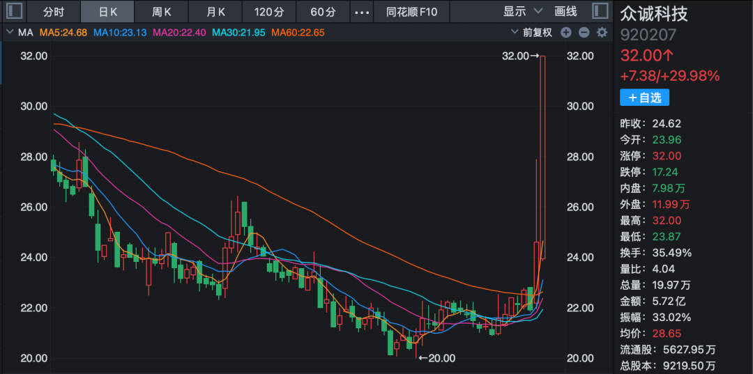最近一周,小市值AI概念股众诚科技成为北交所股票“最靓的仔”。1月9日,该股强势涨停,当天收报32元/股,市值为29.5亿元。
