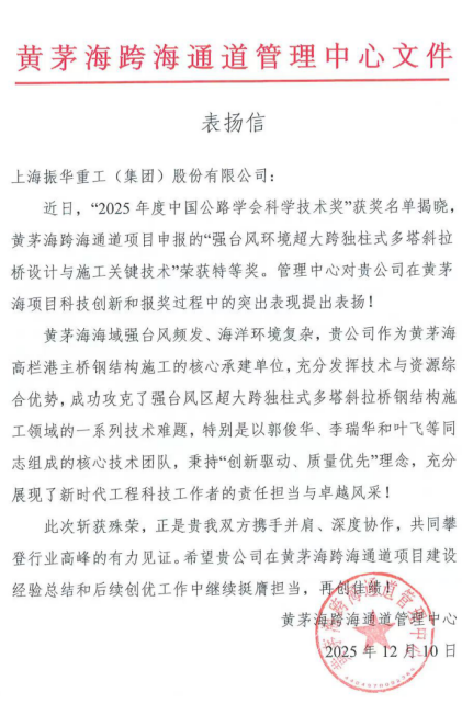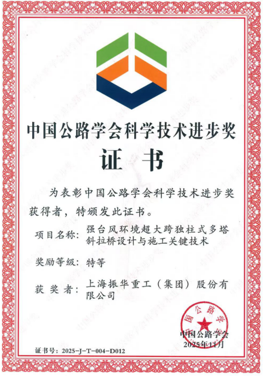 近日,2025年度中国公路学会科技进步奖获奖名单正式揭晓。公司所属振华重装参与申报的《强台风环境超大跨独柱式多塔斜拉桥设计与施工关键技术》项目荣获最高奖项——中国公路学会科技进步特等奖。