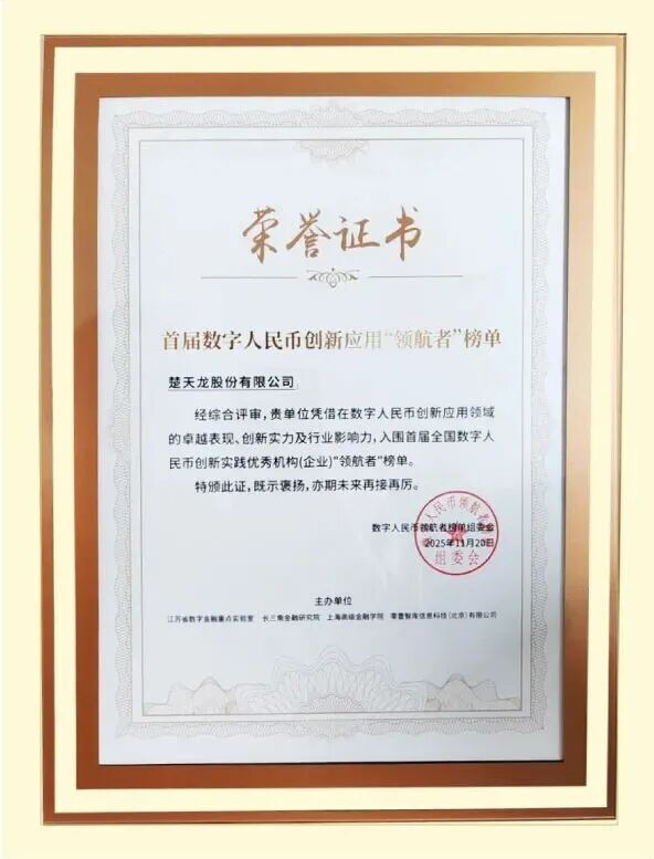 近日,楚天龙(003040)在河北睿通高速公路联网运营有限责任公司指导下,与交通银行河北分行、北京速通全资子公司易路行公司共同完成数字人民币在高速ETC通行场景的首创落地,各项技术指标、支付体验均达到预期标准。凭借此次场景的创新实践,楚天龙成功入选首届全国数字人民币创新应用 “领航者” 榜单,获评 “数字人民币创新实践优秀企业”,并斩获 “数字人民币特色应用标杆场景” 荣誉,成为行业创新应用的重要标杆。