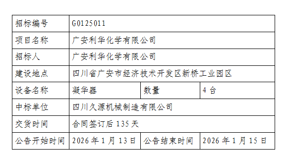 关于广安利华化学有限公司不锈钢凝华器设备公开招标采购结果公示: