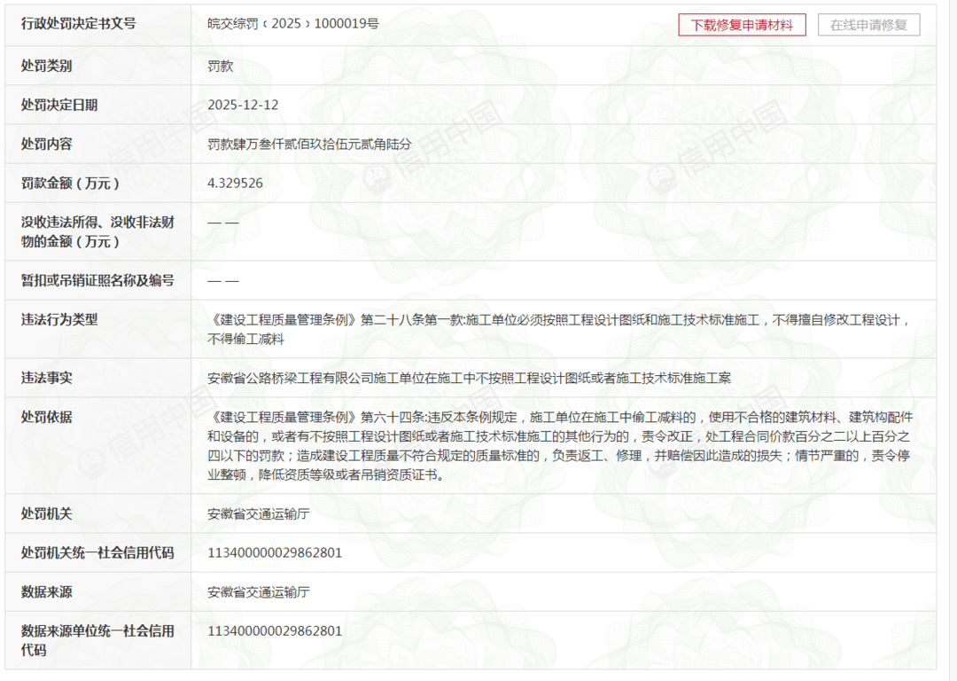 依据《建设工程质量管理条例》相关规定,安徽建工公路桥梁建设集团有限公司被罚款4.329526万元。
