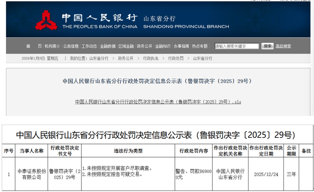 公告显示,中泰证券因未按照规定开展客户尽职调查、未按照规定报告可疑交易,被中国人民银行山东省分行予以警告,并罚款86.9万元。