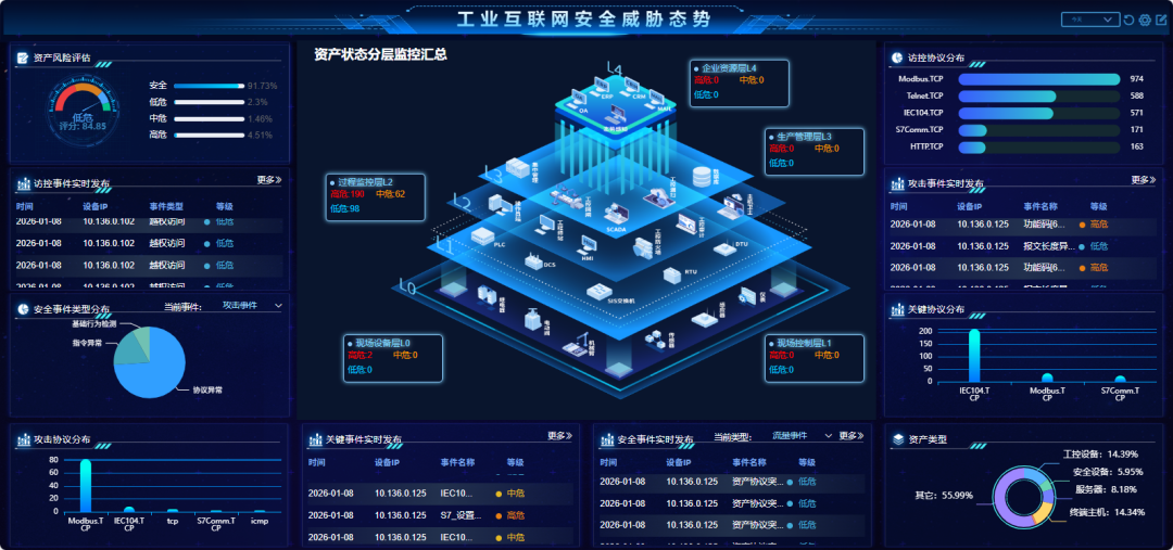 迪普科技自主可控工业互联网边缘智能安全防护系统和平台重点针对工控资产准入控制难、工业协议解析粒度粗、工业流量模型单一、威胁识别漏检率高、主动防御能力缺乏以及工业安全防护软硬件国产化程度低等当前工业互联网突出的安全隐患研发,在国产化高可靠、高性能、强扩展的硬件平台、主被动结合的无损工业资产识别、动态行为基线智能检测等技术上实现了创新突破,经国内外查新,属于全球首创。