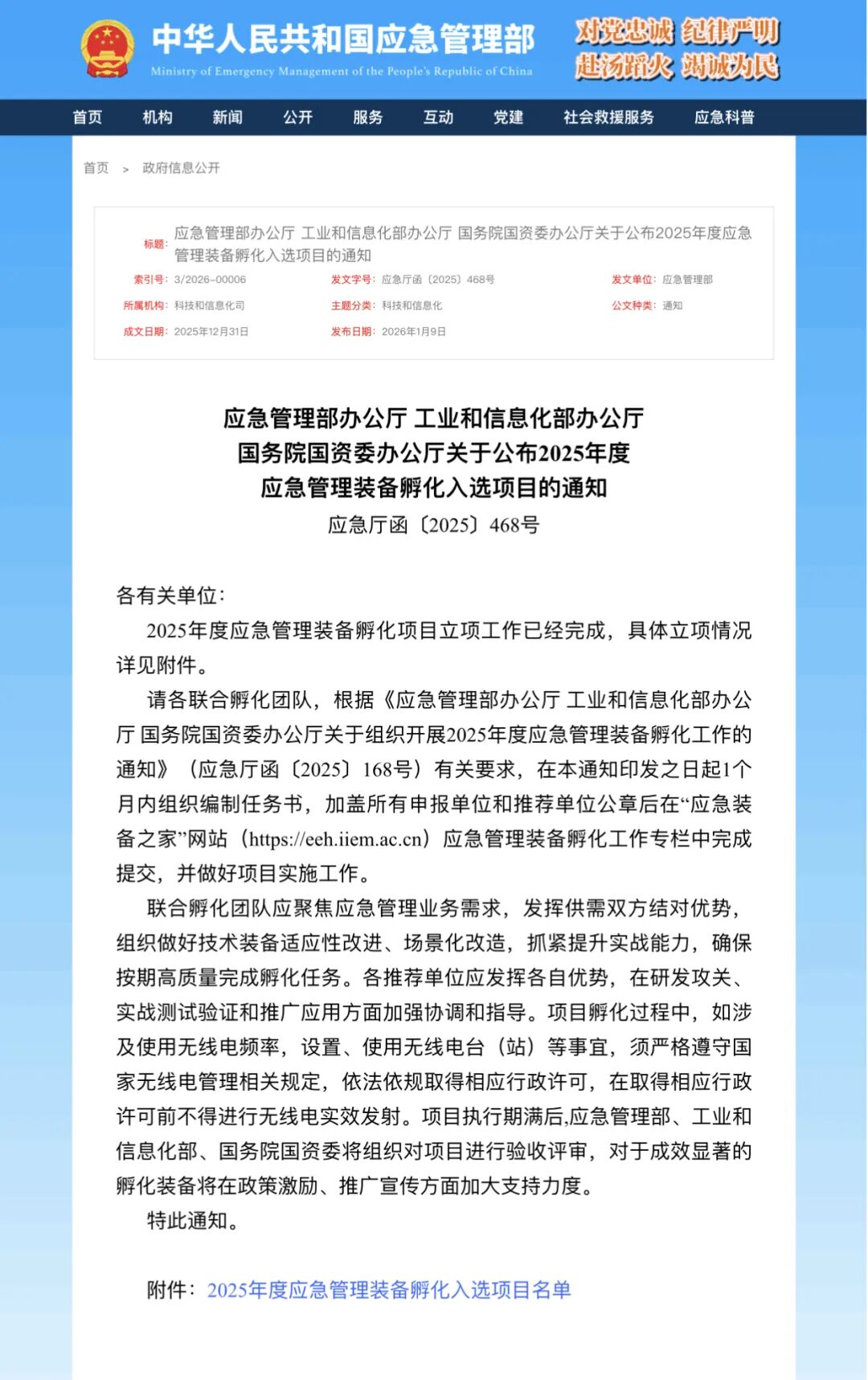 近日,应急管理部办公厅、工业和信息化部办公厅、国务院国资委办公厅联合发布了《关于公布2025年度应急管理装备孵化入选项目的通知》。长沙景嘉微(300474)电子股份有限公司(以下简称“景嘉微”)凭借“复杂空间宽窄带专网通信装备”项目,成功入选2025年度应急管理装备孵化项目名单,这是继公司2025年入围工信部“应急通信装备创新揭榜挂帅”项目任务后,公司在应急通信装备领域的技术实力与研发成果再一次获得国家层面的高度认可。