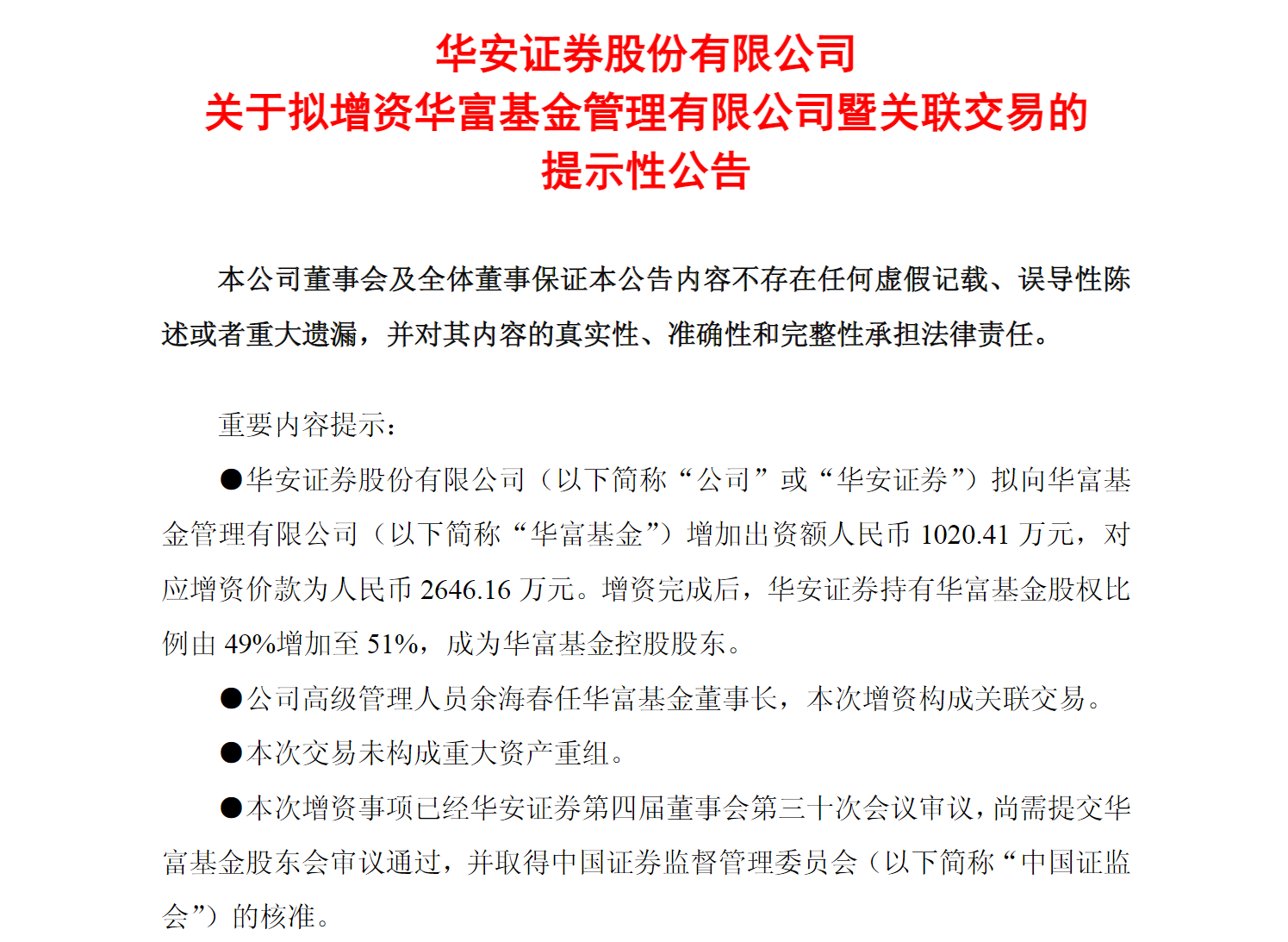 1月12日晚间,华安证券(600909)(600909.SH)发布公告称,公司拟增持华富基金管理有限公司(以下简称“华富基金”)2%股权,增资价款2646.16万元。若本次增资能够获批,华安证券将拥有华富基金51%股权比例,成为华富基金控股股东。