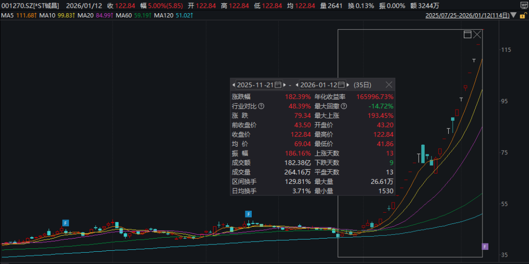 行情数据显示,自2025年12月31日以来,*ST铖昌股票已经连续7个交易日涨停。而若把时间线拉长,自2025年11月下旬以来,公司股价累计涨幅超过180%。