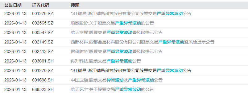 1月12日晚间,还有数十家A股公司发布股价异常波动公告,其中,顺灏股份(002565)、航天发展(000547)、西部材料(002149)、雷科防务(002413)、再升科技(603601)、中国卫通(601698)、航天环宇等发布了股票交易严重异常波动相关公告。