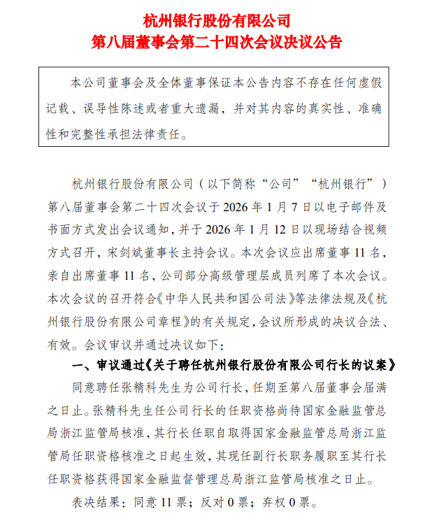 1月12日晚间,杭州银行(600926)(600926.SH)发布公告称,该行董事会聘任现任副行长张精科为新任行长,其任职资格尚需监管部门核准。