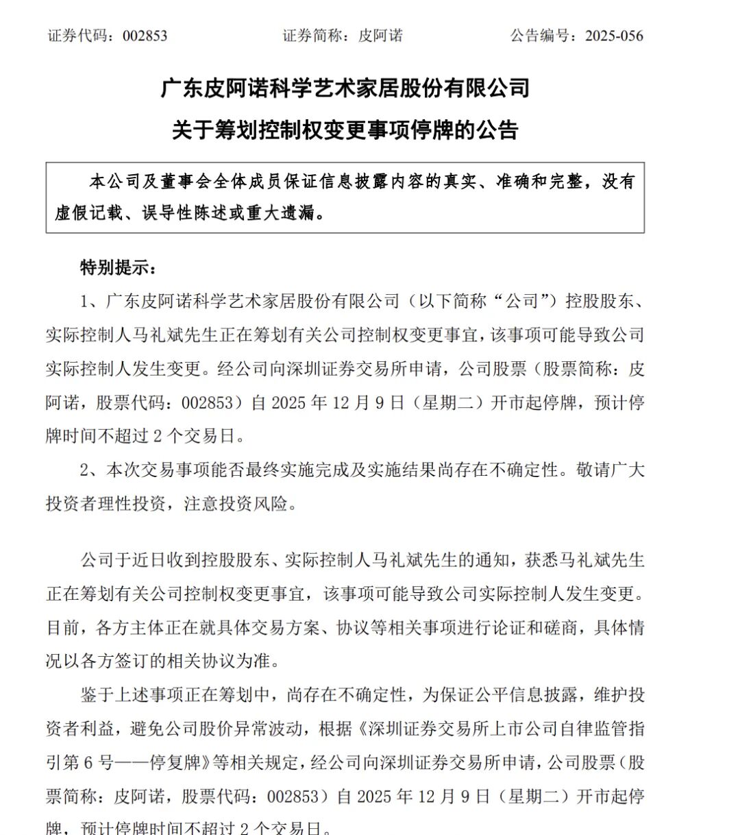 12月8日晚间,皮阿诺披露停牌公告,称公司控股股东、实际控制人马礼斌正在筹划有关公司控制权变更事宜。经申请,公司股票将于12月9日(星期二)开市起停牌,预计停牌时间不超过2个交易日。