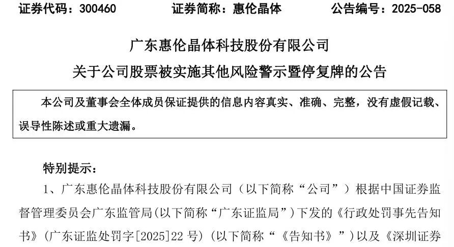 惠伦晶体涉嫌信息披露违法违规被立案一事,有了结果。