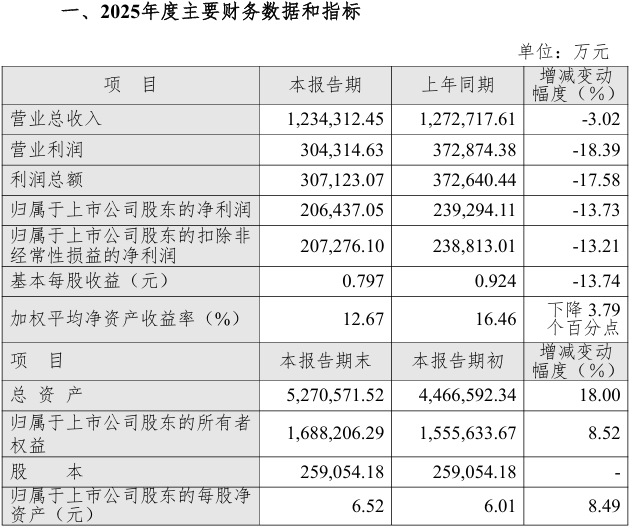 北极星电力网获悉,1月12日晚间,新集能源(601918)披露2025年业绩快报,公司实现营业收入123.43亿元,同比下降3.02%;归母净利润20.64亿元,同比下降13.73%;扣非净利润20.73亿元,同比下降13.21%;基本每股收益0.797元,加权平均净资产收益率为12.67%。