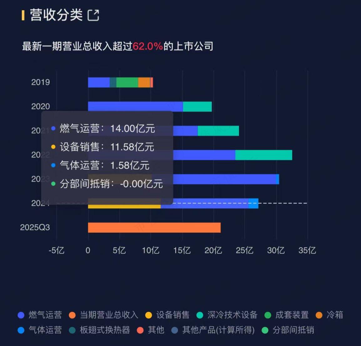 2025年,这些海外订单进入集中交付期,带动业绩大幅增长。2025年上半年,海外收入达1.7亿元,同比增长576.5%,占总收入的13%。设备板块的业绩释放,也带动深冷板块收入贡献率首次超过城燃板块。